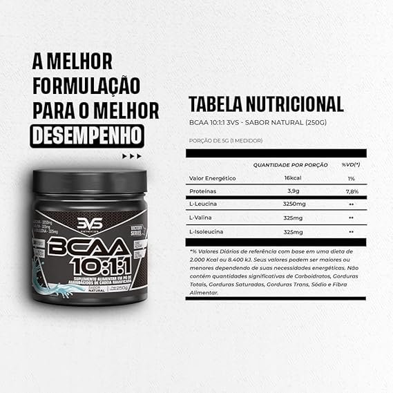 - Sugestão de uso: Adicione 1 dosador (5g) de BCAA 10:1:1 em 100 ml de água, consuma cerca de 30 minutos antes do treino e tome outra dose logo após a atividade física.