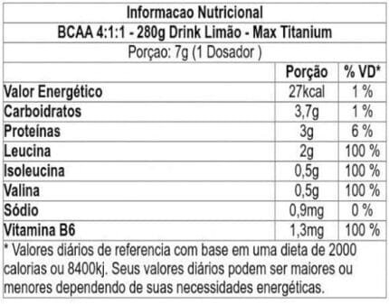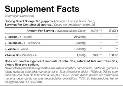 | Porção recomendada | Sugestão de uso: Adicione 1 dosador (5g) de BCAA 3:1:1 em 120 ml de água, consuma cerca de 30 minutos antes do treino e tome outra dose logo após a atividade física |