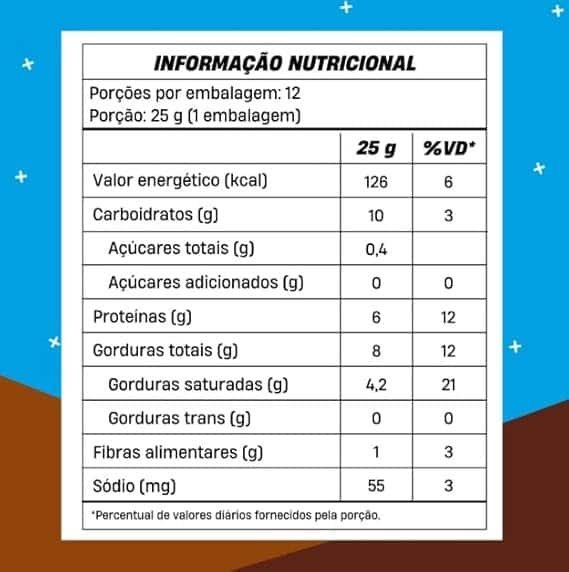 Ingredientes ‎Proteína concentrada do soro do leite, gordura de palma, manteiga de cacau, wafer, massa de cacau, flocos de arroz, cacau em pó, polidextrose, emulsificantes: lecitina de soja e polirricinoleato de poliglicerol, aromatizantes e edulcorantes: maltitol e sucralose.