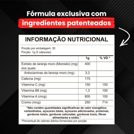 Café verde moído, cafeína, extrato de laranja moro (Citrus sinensis L. Osbeck), tartarato de L-carnitina, guaraná em pó (Paullinia cupana), picolinato de cromo, nicotinamida, pantotenato de cálcio, cloridrato de piridoxina, biotina, mononitrato de tiamina, riboflavina, ácido fólico, cianocobalamina, aromatizantes naturais extrato da casca de laranja amarga (Citrus aurantium), chá verde, gengibre em pó, pimenta caiena, agente de fosfato tricálcico, antiumectante dióxido de silício, corantes azul brilhante FCF, eritrosina e tartrazina, gelificante gelatina, lubrificante estearato de magnésio. NÃO CONTÉM GLÚTEN.