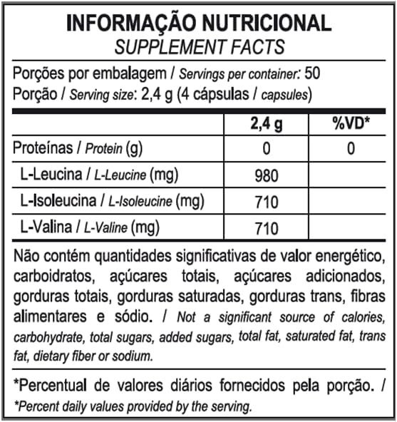 L-leucina, L-valina, L-isoleucina, antiumectante fosfato tricálcico, cápsula (gelatina, água purificada e conservante. NÃO CONTÉM GLÚTEN.