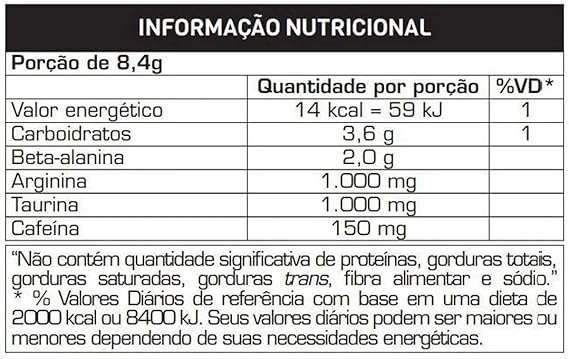 Beta Alanina, isomaltulose, arginina, taurina, cafeína, aromatizantes, acidulante ácido cítrico, edulcorante sucralose, antiumetante dióxido de silício, e corantes artificiais amaranto e azul brilhante fcf. NÃO CONTÉM GLÚTEN.