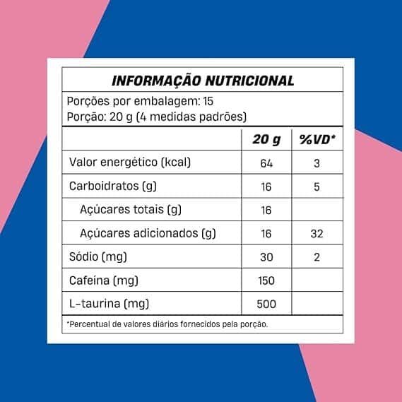 Palatinose; L-Taurina; Cafeína anidra; Acidulante ácido cítrico; Gengibre em pó; Aroma idêntico ao natural; Corante natural de beterraba; Espessante goma xantana; Edulcorantes naturais (stevia e xilitol).