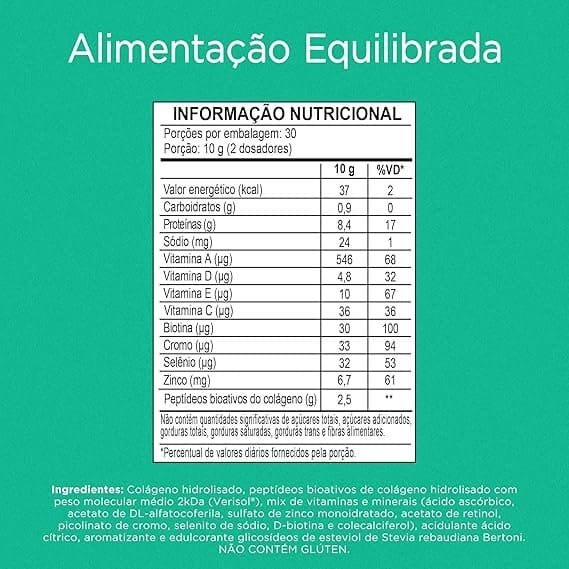 : Colágeno hidrolisado, colágeno hidrolisado bioativo (Verisol®), mix de vitaminas e minerais [vitamina C (ácido ascórbico), vitamina E (DL alfa-acetato de tocoferol), zinco (sulfato de zinco mono-hidratado), vitamina A (acetato de retinol), cromo (picolinato de cromo), selênio (selenito de sódio), vitamina H (biotina) e vitamina D (colecalciferol)], acidulante ácido cítrico, aroma sintético idêntico ao natural, edulcorante estévia e corante betacaroteno