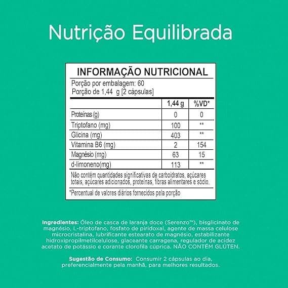 SERENZO™ (D-limoneno), L-triptofano, bisglicinato de magnésio e fosfato de piridoxal (vitamina B6)
