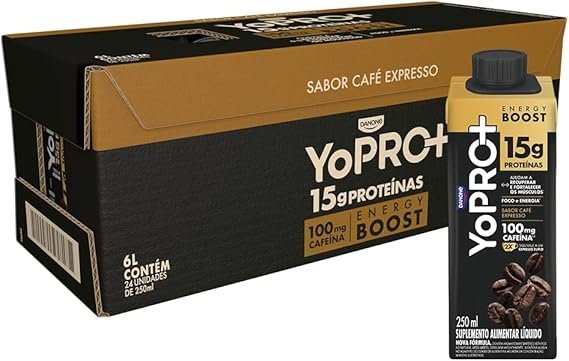 Energize seu dia com YoPRO Energy Boost UHT 15g de Proteínas Café Expresso. O YoPRO Energy BOOST UHT contém 15g de proteínas, proporcionando saciedade e auxiliando na construção e recuperação muscular¹, Whey e Caseína. É zero lactose e fonte de cálcio. Além de todos esses benefícios, conta também com uma dose de 100mg cafeína, que equivale a um expresso duplo, trazendo energia e foco para os seus treinos. É essencial para você que pratica exercícios físicos regularmente e quer dar um boost em seu desempenho. Além de auxiliar no seu consumo diário de proteínas, é um aliado para sua performance física e seu bem-estar, complementando a sua rotina de forma saudável e saborosa. ¹ aliado a uma rotina regular de treinos e alimentação saudável. ² recomendação diária de consumo é de 1 produto, e deve ser feita por maiores de 19 anos. Consulte seu médico e/ou nutricionista. Ingredientes leite e/ou leite reconstituído parcialmente desnatado, proteína concentrada de leite, proteína de soro de leite concentrada, amido modificado, café solúvel, soro de leite, cafeína, estabilizantes celulose microcristalina, citrato de sódio, carboximetilcelulose sódica e goma gelana, reguladores de acidez fosfato dipotássico e fosfato dissódico, aromatizante e edulcorante sucralose. NÃO CONTÉM GLÚTEN. ALÉRGICOS: CONTÉM LEITE E DERIVADOS. PODE CONTER SOJA.
