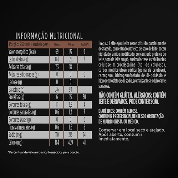 Leite parcialmente desnatado, concentrado proteico de leite em pó, amido modificado, concentrado proteico de soro de leite em pó, enzima lactase, estabilizantes celulose microcristalina, carboximetilcelulose, carragena, fosfato dipotássico e fosfato dissódico, aromatizantes, corante natural carmim e edulcorante sucralose. ÃO CONTÉM GLÚTEN. ALÉRGICOS: CONTÉM LEITE E DERIVADOS. PODE CONTER SOJA. DIABÉTICOS: CONTÉM GLICOSE. CONSUMIR PREFERENCIALMENTE SOB A RECOMENDAÇÃO DE NUTRICIONISTA OU MÉDICO