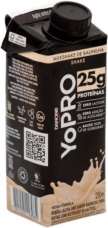 Potencialize seus treinos com YoPRO Bebida Láctea UHT Baunilha 25g de proteínas 250ml – 24 unidades! YoPRO é a marca especialista em criar produtos com alto teor de proteínas, práticos e deliciosos para quem busca uma rotina ativa e saudável. YoPRO é proteína, sabor e praticidade para sua rotina. O YoPRO Shake Proteico 250ml contém 25g de proteínas, que proporcionam saciedade e auxiliam na construção e recuperação muscular¹, Whey e Caseína, também é zero lactose, zero adição de açúcares², tem baixo teor de gorduras e é fonte de cálcio. Você pode consumir seu YoPRO Shake Proteico UHT 25g de proteínas a qualquer momento, seja como parte do seu café da manhã, como lanche entre as refeições ou antes e depois dos treinos. Sua fórmula prática e deliciosa permite que você o leve para onde quiser, seja na academia ou no trabalho. É essencial para você que busca um estilo de vida ativo e saudável, além de com o seu consumo de proteínas diárias, é um aliado para sua performance física e seu bem-estar, complementando a sua rotina de forma saudável e saborosa. YoPRO É MAIS PROTEÍNA, SABOR E PRATICIDADE PARA SUA ROTINA. Experimente e vá além! CARACTERÍSTICAS • YoPRO Shake contém 25g de proteínas por porção de 250ml. • Contém 9 aminoácidos essenciais, Whey e Caseína, zero lactose, zero adição de açúcares², tem baixo teor de gorduras e é fonte de cálcio. • Prático e pronto para consumo, é perfeito para acompanhar a rotina agitada do dia a dia. • Você pode levar para qualquer lugar, a qualquer hora. • Com proteínas que ajudam na recuperação e no ganho de massa muscular¹ • Sabores deliciosos, nas versões Chocolate, Morango, Banana, Coco com Batata-Doce e Baunilha. • Seu pré e pós-treino proteico, delicioso e prático. ¹ aliado a uma rotina regular de treinos e alimentação saudável. ² contém açúcares dos próprios ingredientes. Ingredientes: leite parcialmente desnatado, concentrado proteico de soro de leite, cacau hidratado, amido modificado, concentrado proteico de leite, soro de leite em pó, enzima lactase, aromatizantes, estabilizantes celulose microcristalina, carboximetilcelulose, carragena, fosfato dipotássico e fosfato dissódico e edulcorante sucralose. NÃO CONTÉM GLÚTEN. ALÉRGICOS: CONTÉM LEITE E DERIVADOS. PODE CONTER SOJA.