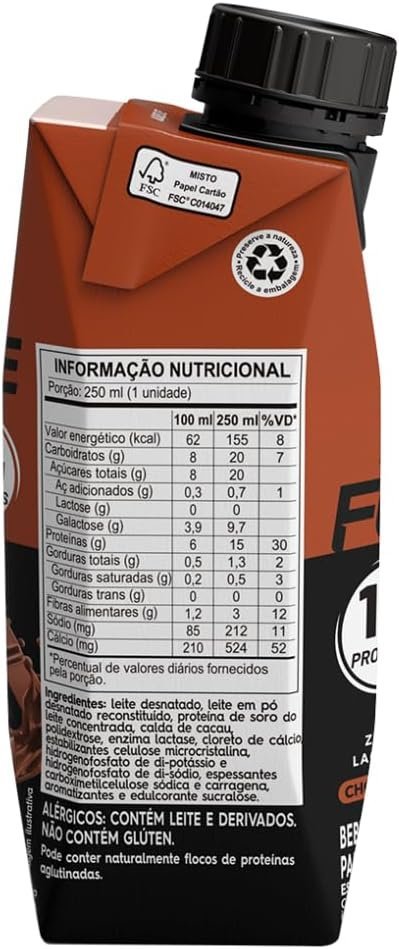 Ingredientes ‎Leite desnatado, leite em pó desnatado reconstituído, soro de leite (whey) concentrado, calda de cacau, polidextrose, enzima lactase, cloreto de cálcio, estabilizantes celulose microcristalina, fosfato dipotássico e fosfato dissódico, espessantes carboximetilcelulose sódica e carragena, aromatizantes e edulcorante sucralose.