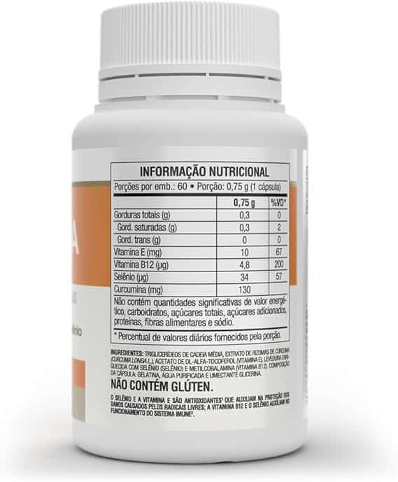 Triglicerídeos de cadeia média (veículo), extrato de rizomas de Curcuma longa, levedura enriquecida com selênio (selênio), acetato de DL-alfa-tocoferol (vitamina E) e metilcobalamina (vitamina B12). Composição da cápsula: gelatina, água puricada e umectante glicerina. NÃO CONTÉM GLÚTEN