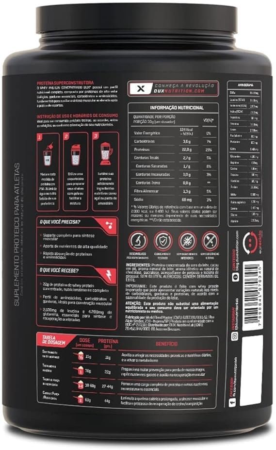 WHEY PROTEIN CONCENTRADO (900g) – DUX NUTRITION O Whey Protein Concentrado Dux Nutriton é composto por proteínas de alto valor biológico e rápida absorção, além de gorduras essenciais, carboidratos e uma ampla gama de aminoácidos, fundamentais para garantir a síntese muscular acelerada após a prática de esportes. É ideal para ser consumido antes e depois de treinos, mas também pode fazer parte do café da manhã ou servir como um lanche entre as refeições, e em outros momentos conforme a orientação do seu nutricionista. Se há um nutriente indispensável, é a proteína. Ela é feita de aminoácidos, que são os blocos de construção do nosso corpo. A proteína do soro do leite, em inglês ?Whey Protein?, é uma das fontes de aminoácidos de melhor absorção, maior até que o frango ou peixe. Isso torna o Whey uma forma conveniente de ingerir proteína, melhorando a saúde, o bem-estar e os resultados dos treinos. BENEFÍCIOS: > Não contém goma xantana, complexos vitamínicos à base de maltodextrina, espessantes, estabilizantes, conservantes ou qualquer outro ingrediente inferior;> Contém corantes 100% naturais, sem ingredientes artificiais;> O nome diz tudo: Whey Protein Concentrado 100% puro, com transparência total, do nome do produto à lista de ingredientes;> Matéria-prima premium importada, com alto teor de leucina, desenvolvida para criar um produto com sabor real e marcante;> Valores nutricionais robustos, sem excessos, com quantidades ideais de carboidratos e gorduras do leite;> 20g de proteína;> Proteína moderna, desenvolvida por especialistas para atletas de esportes de performance (bodybuilding, crossfit e artes marciais), pessoas que buscam uma proteína com baixa caloria (para snacks fit e receitas sem culpa) e pessoas que buscam uma proteína ultrapura de altíssima qualidade.