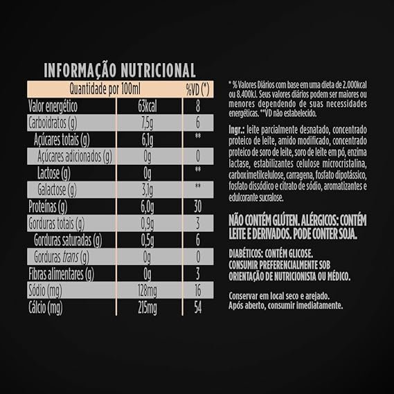| Ingredientes | Leite parcialmente desnatado, concentrado proteico de leite, amido modificado, concentrado proteico de soro de leite, soro de leite em pó, enzima lactase, estabilizantes celulose microcristalina, carboximetilcelulose, carragena, fosfato dipotássico, fosfato dissódico, aromatizantes e edulcorante sucralose. |